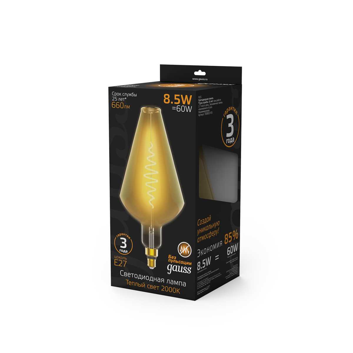 Лампа светодиодная филаментная Gauss E27 8,5W 2000K янтарная 180802105 купить в интернет-магазине светильников Mitris.kz!