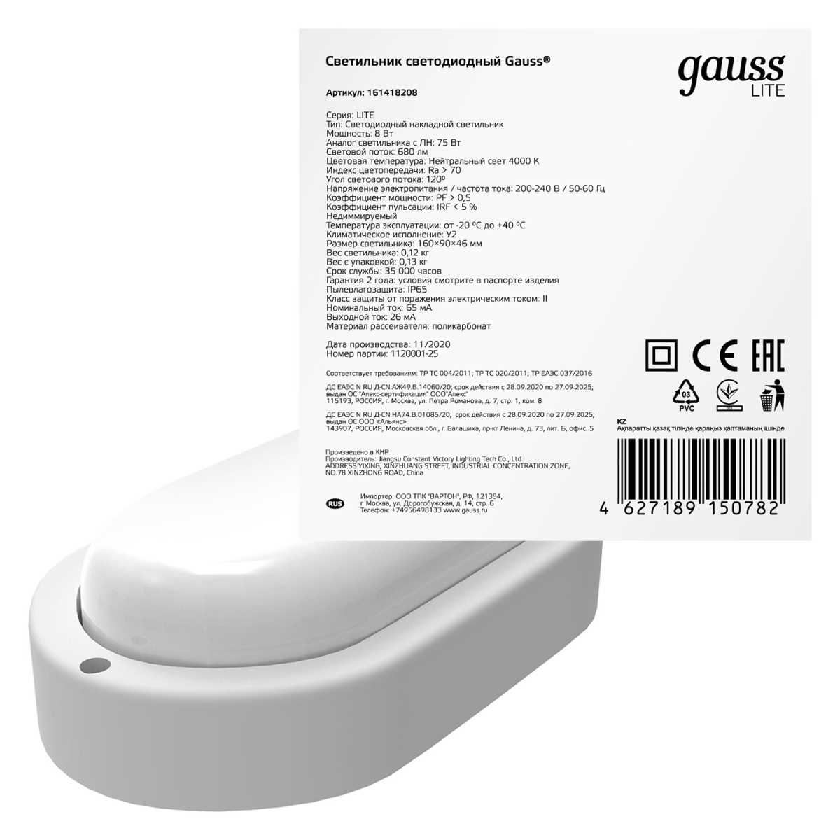 Настенно-потолочный светодиодный светильник Gauss Lite 161418208 купить в интернет-магазине светильников Mitris.kz!