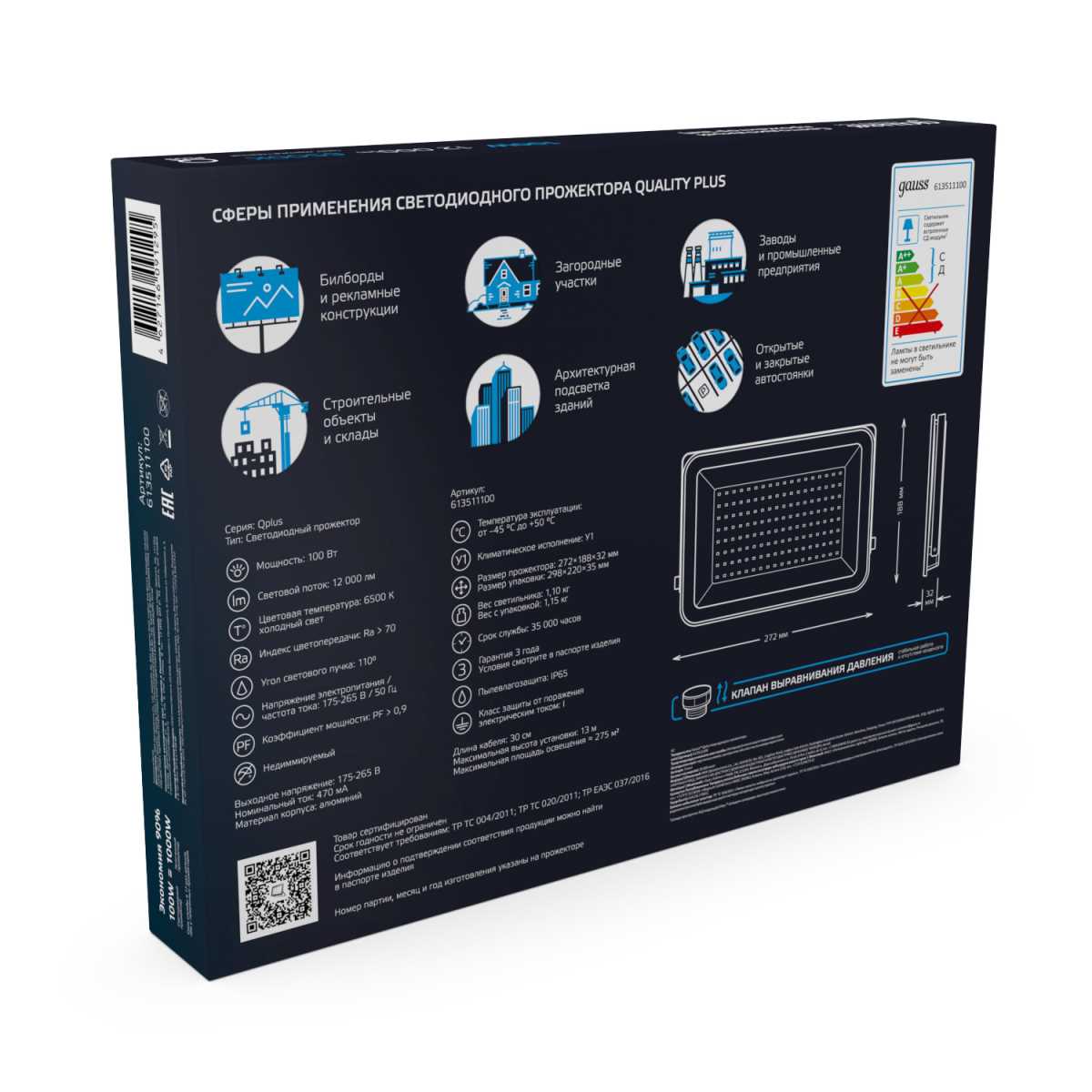 Прожектор светодиодный Gauss Qplus 100W 6500К 613511100 купить в интернет-магазине светильников Mitris.kz!