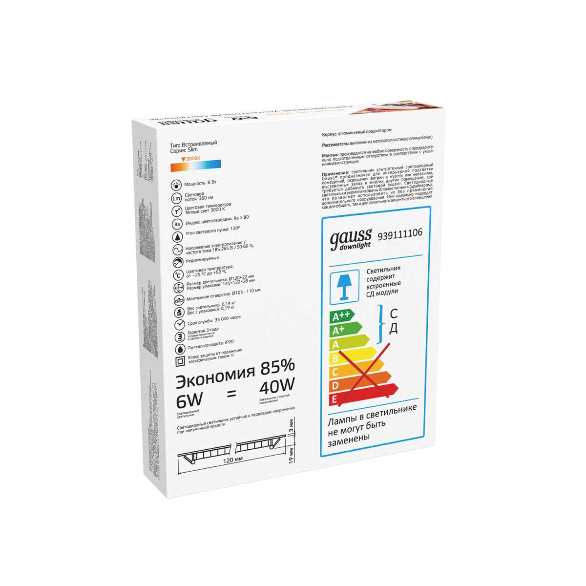 Встраиваемый светодиодный светильник Gauss 939111106 купить в интернет-магазине светильников Mitris.kz!