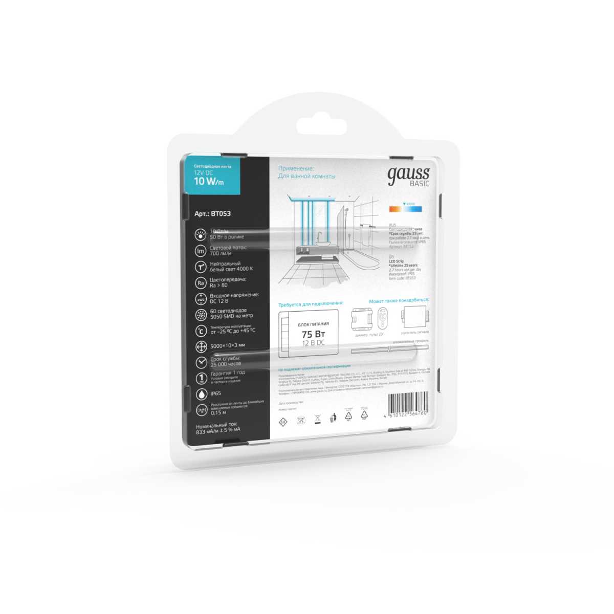 Светодиодная лента Gauss 10W/m 60LED/m 5050SMD нейтральный белый 5M BT053 купить в интернет-магазине светильников Mitris.kz!