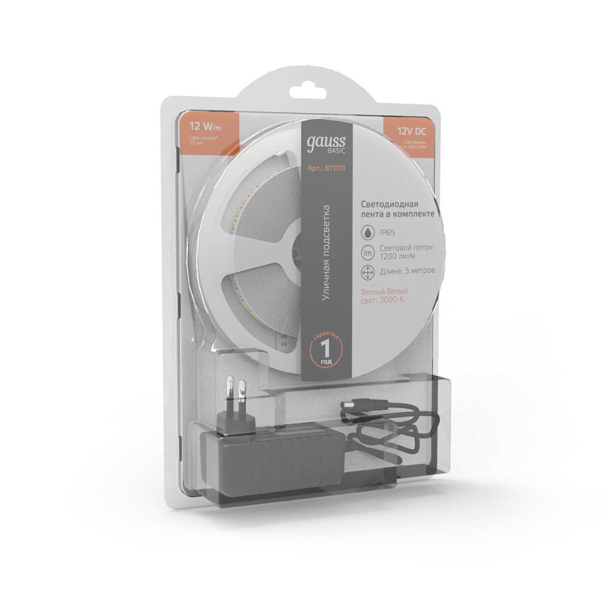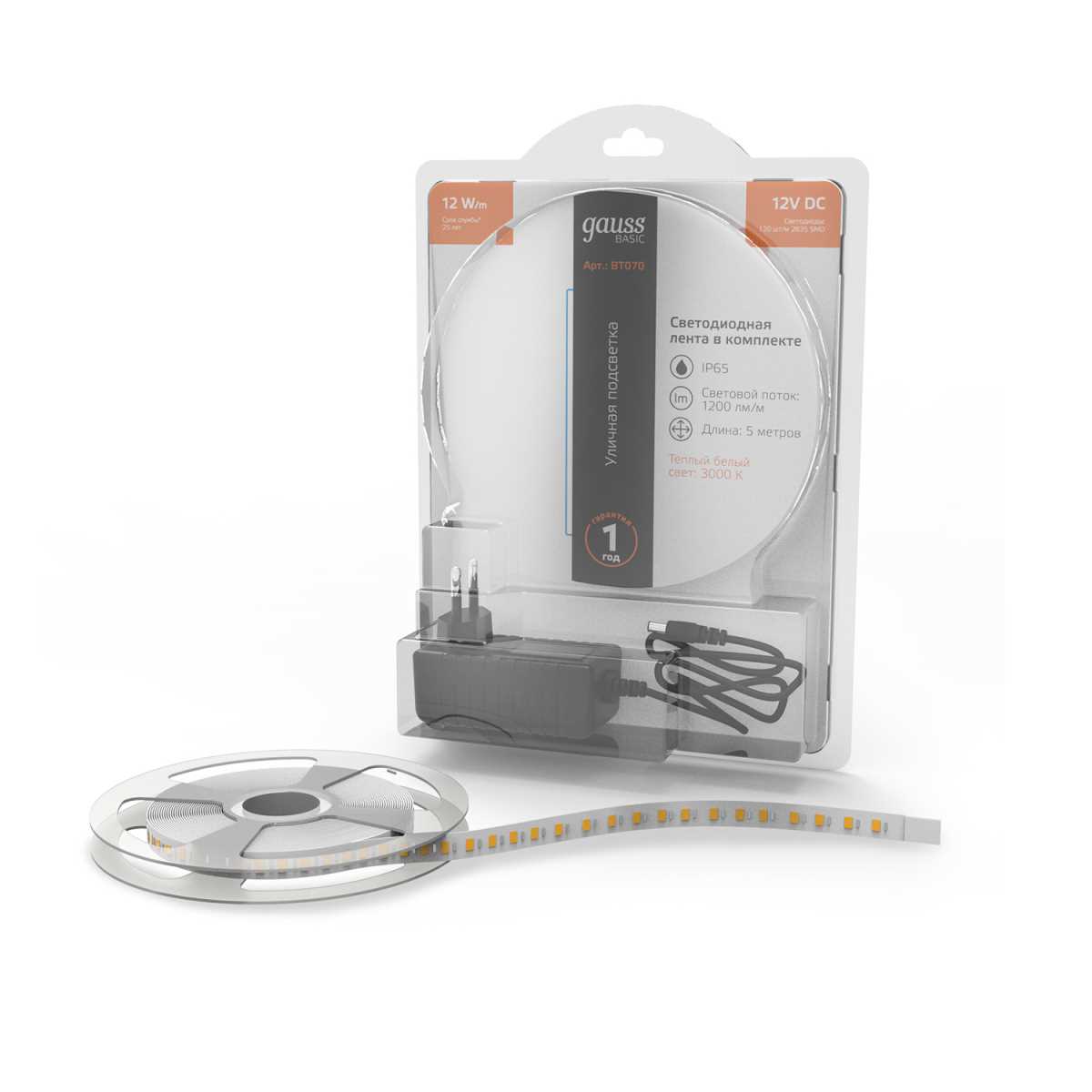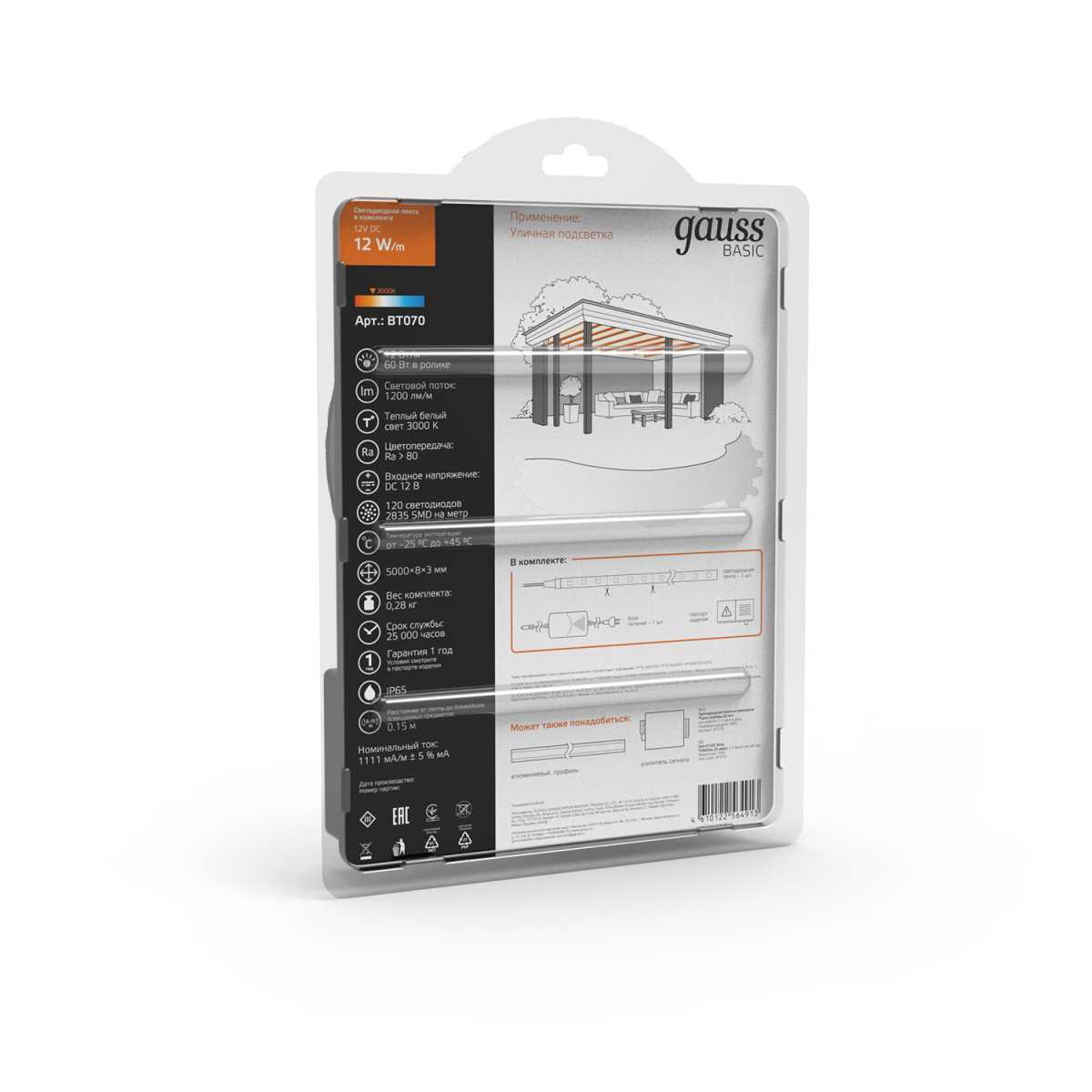 Светодиодная лента Gauss 12W/m 120LED/m 2835SMD теплый белый 5M BT070 купить в интернет-магазине светильников Mitris.kz!