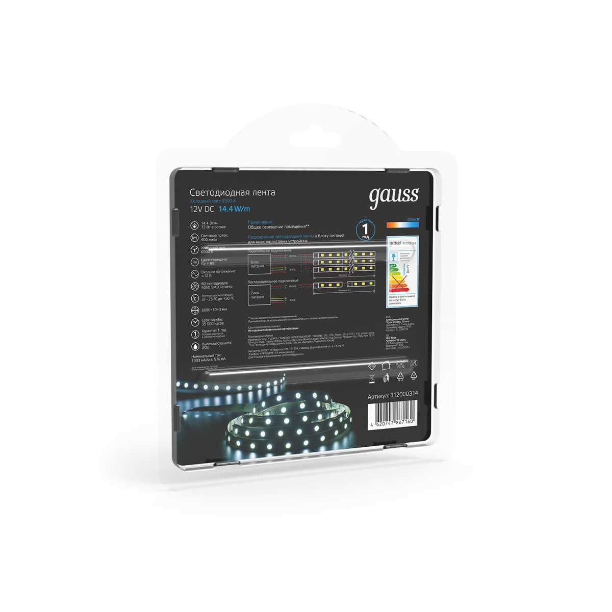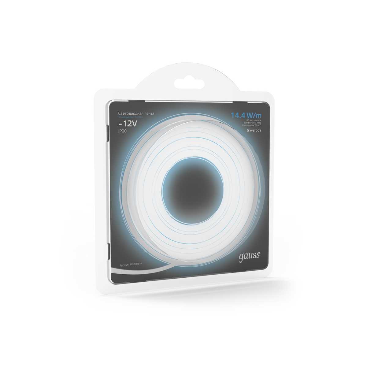 Светодиодная лента Gauss 14,4W/m 60LED/m 5050SMD холодный белый 5M 312000314 купить в интернет-магазине светильников Mitris.kz!