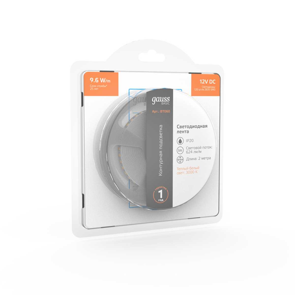 Светодиодная лента Gauss 9,6W/m 120LED/m 2835SMD теплый белый 2M BT060 купить в интернет-магазине светильников Mitris.kz!