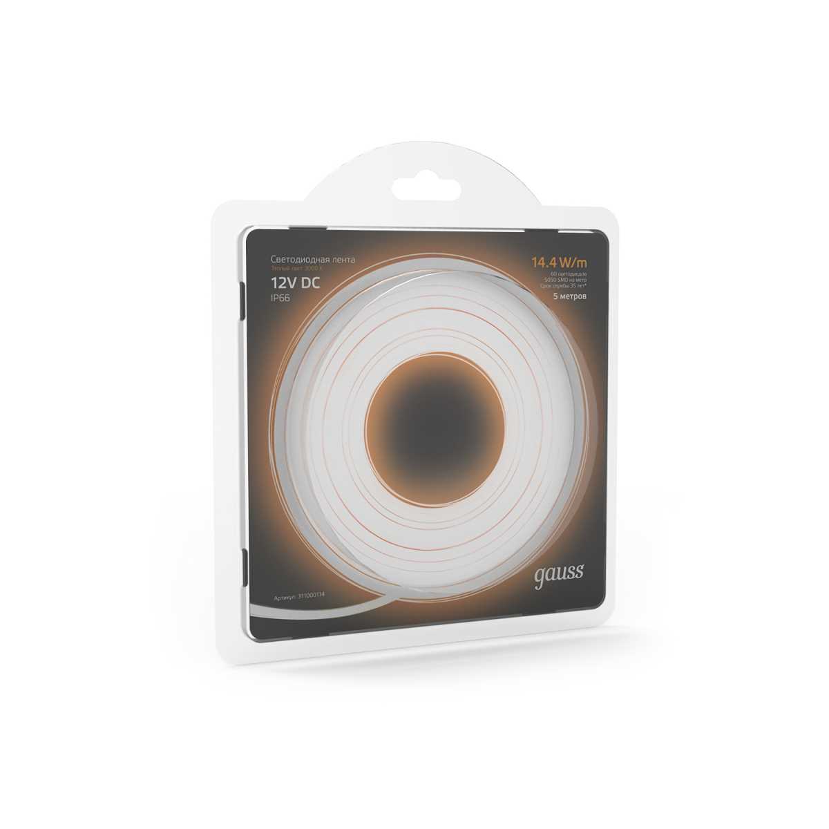 Светодиодная влагозащищенная лента Gauss 14,4W/m 60LED/m 5050SMD теплый белый 5M 311000114