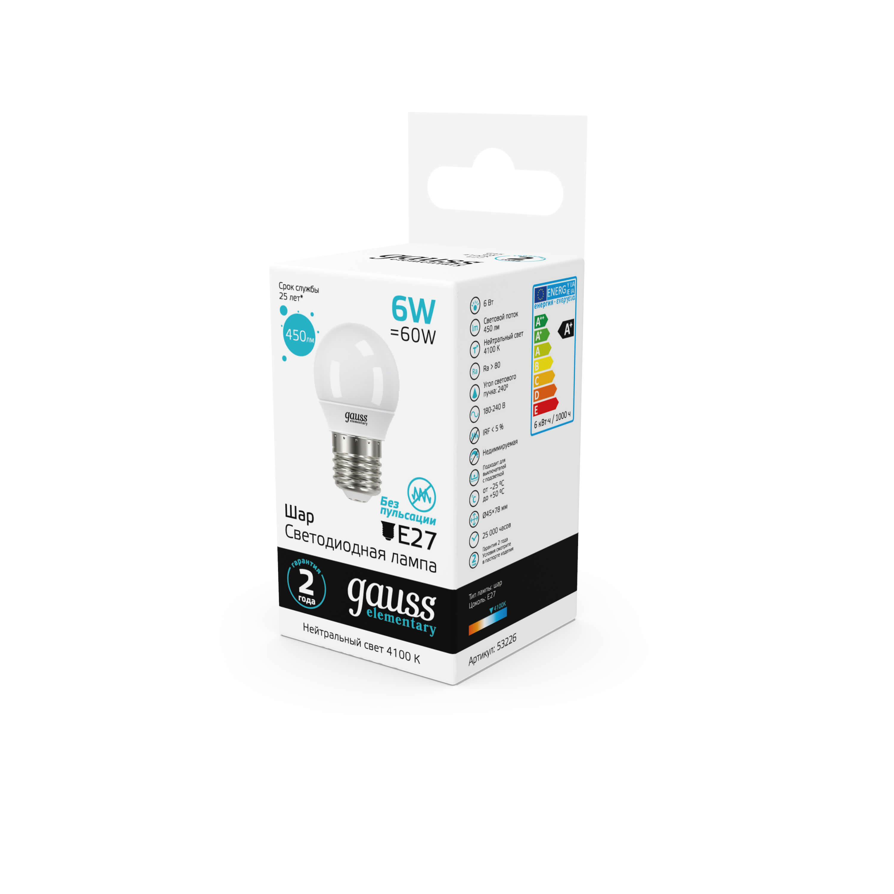 Лампа светодиодная Gauss E27 6W 4100K матовая 53226