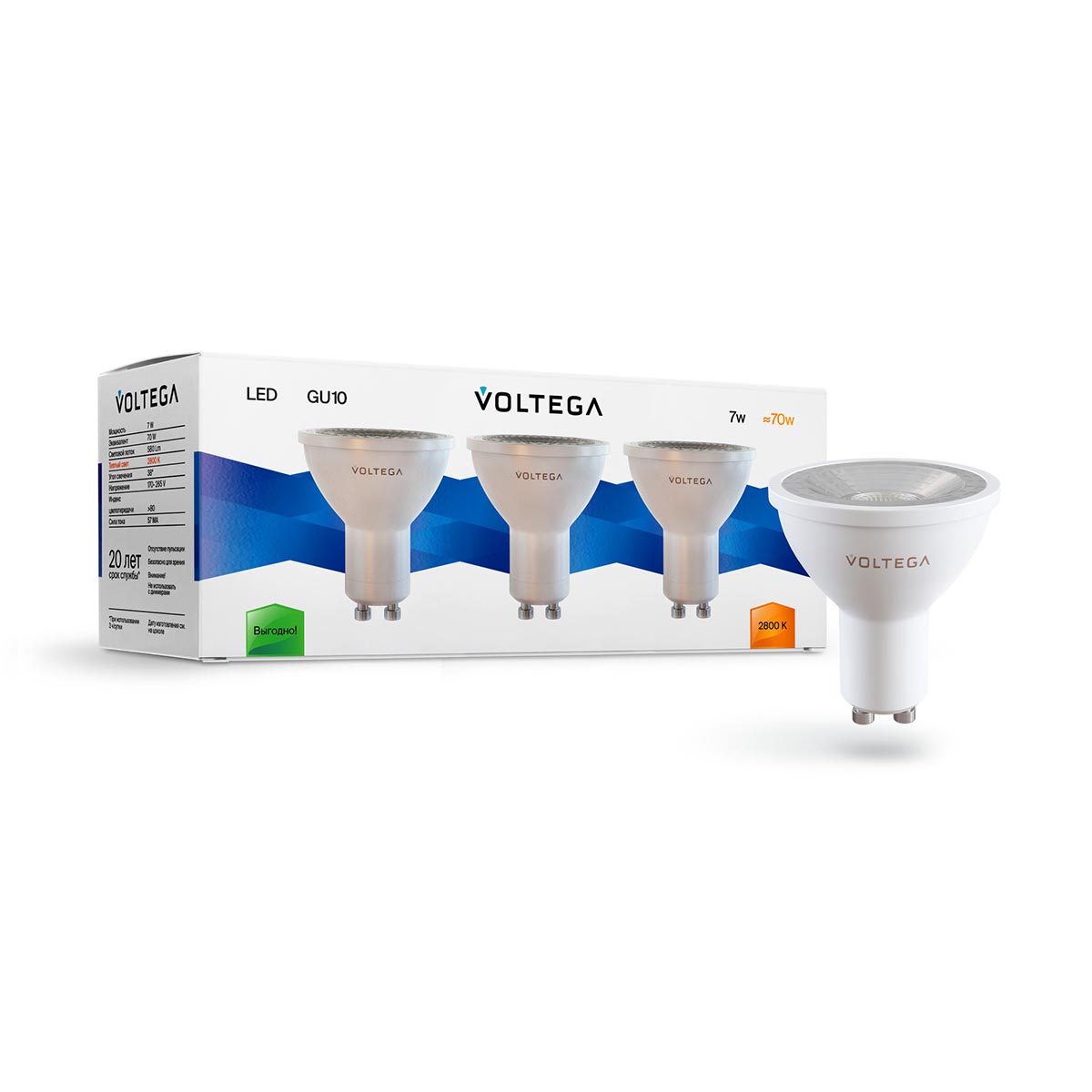 Набор светодиодных ламп Voltega GU10 7W 2800К прозрачная 7176
