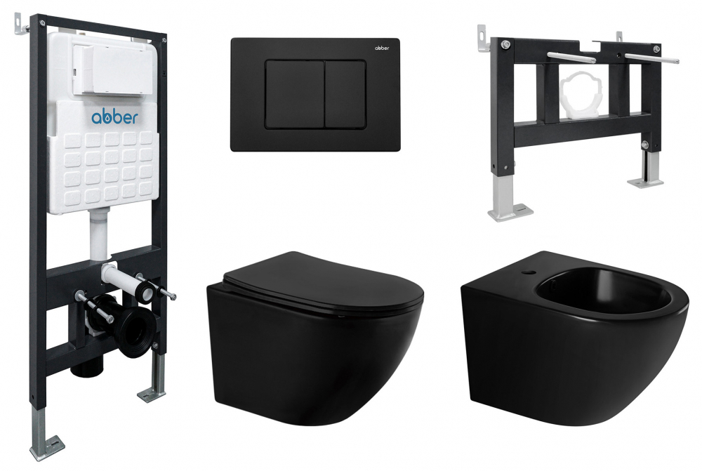 Комплект ABBER унитаз AC1100MB черный матовый с инсталляцией AC0105 и кнопкой AC0120MB, биде AC1150MB с инсталляцией AC0101P купить в интернет-магазине светильников Mitris.kz!